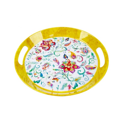 Forma rotonda colorato fiore modello di decalcomania di plastica vassoi di servizio melamina vassoi con manico