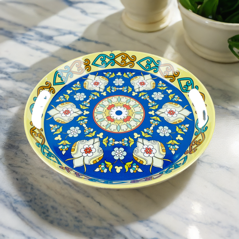 Vassoio rotondo floreale da 13.8 pollici con disegno con decalcomania in melamina per la cucina dell'hotel del ristorante con manico in plastica piatto blu bianco